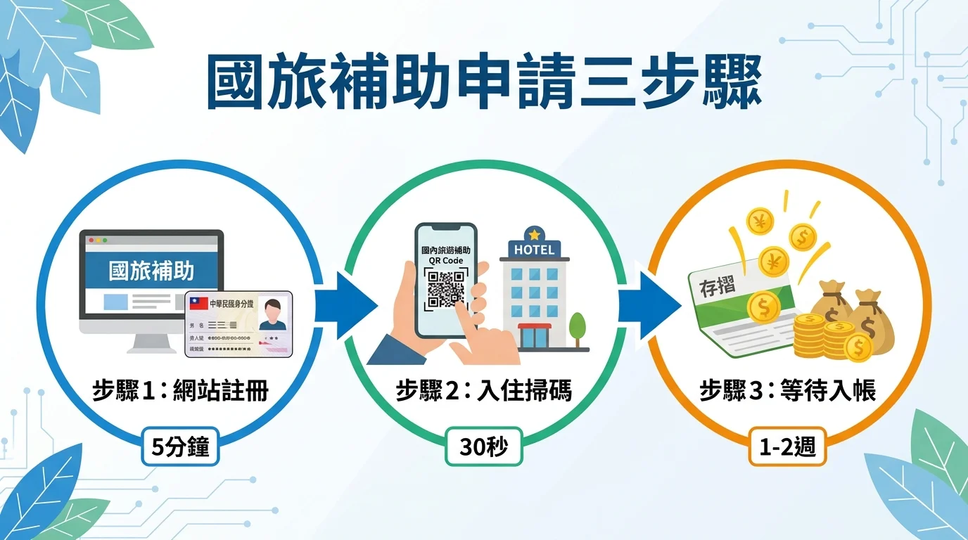 A: 3 步驟搞定:(1) 到觀光署國旅補助網站註冊帳號、上傳身分證 → (2) 入住合作飯店時出示 QR Code 掃碼核銷 → (3) 等待補助撥款入帳(約 1-2 週)。整個申請過程不到 10 分鐘。