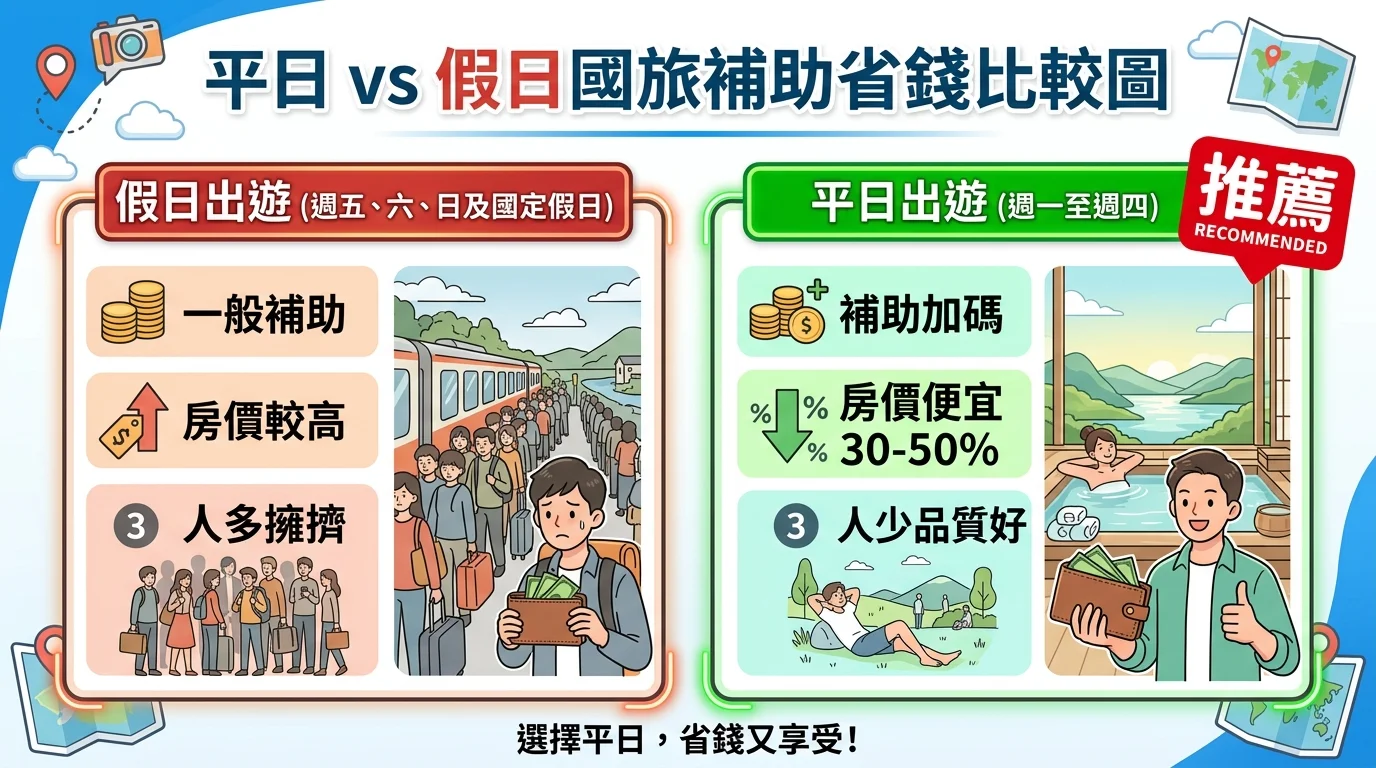 平日住宿補助連住兩晚最高拿 2,000 元,加上飯店平日房價本來就比假日便宜 30-50%。挑週三、週四連住兩晚出遊,省最多。