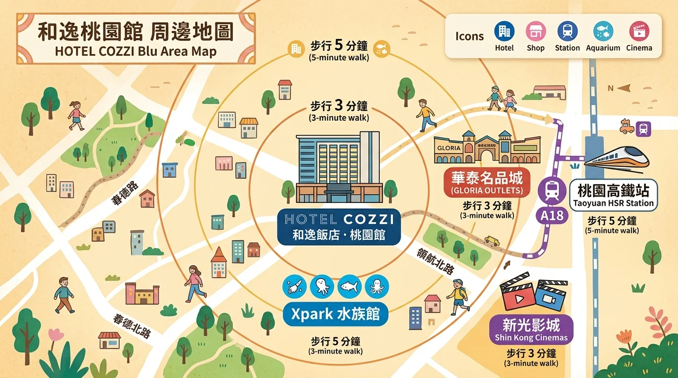 和逸桃園館能排第一,靠的不只是 Xpark。我們觀察到,這間飯店把「親子便利性」做到了極致——從高鐵站出站、到飯店 check in、到 Xpark 入場、到 Outlet 逛街,全程步行不超過 10 分鐘。帶小孩不用搬行李上下車,這對爸媽來說太重要了。