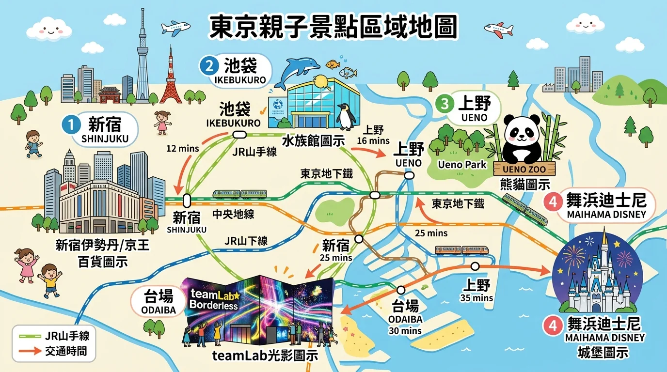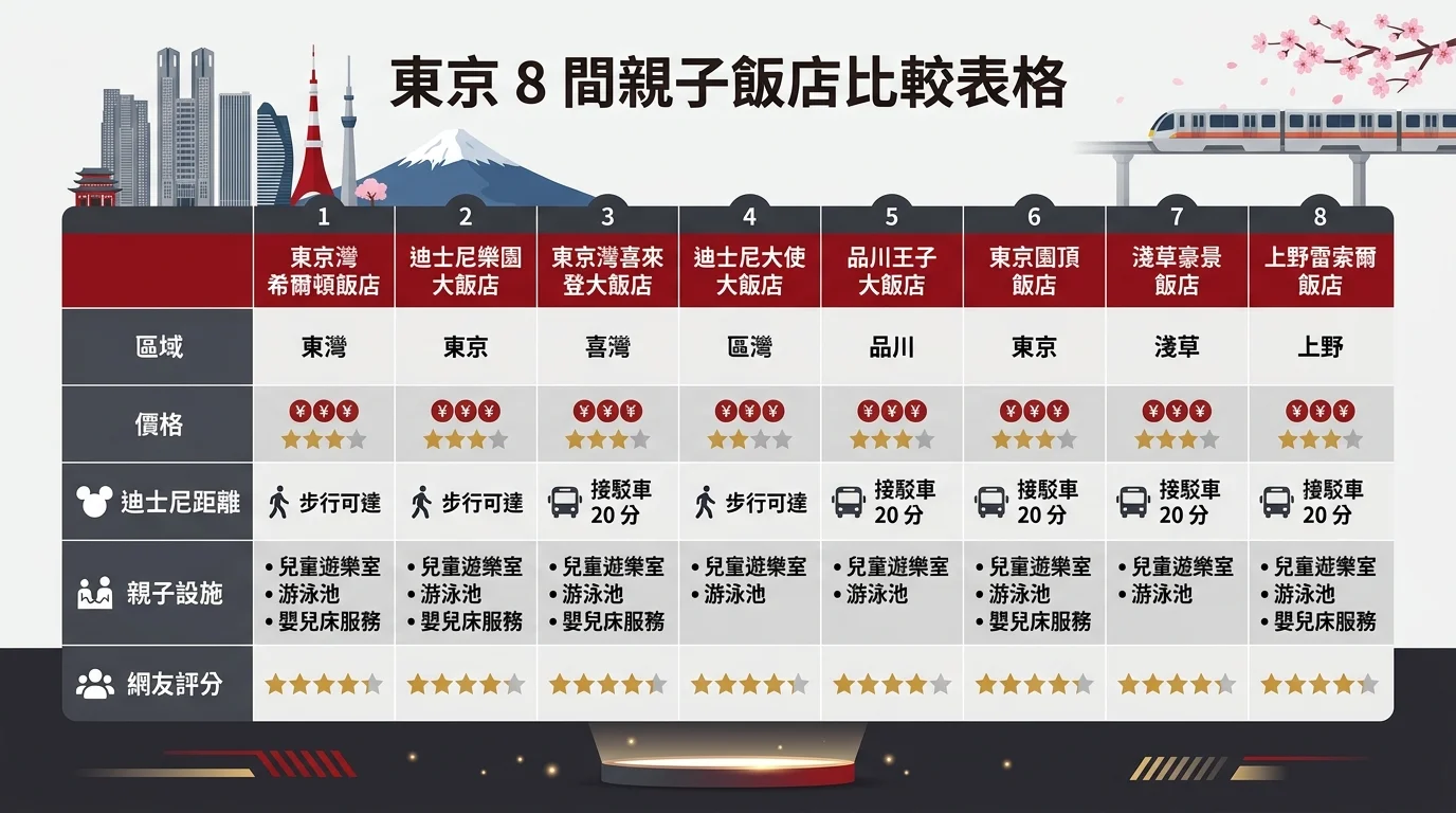 TL;DR: 東京親子住宿依行程選區域:玩迪士尼住舞浜、逛景點住新宿或上野、海景度假住台場。多數飯店 6 歲以下免費,一晚約 4,000-12,000 台幣,迪士尼官方飯店最貴但體驗最好。