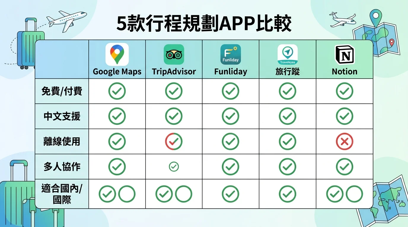 A: 看你的習慣。Excel 最簡單直接,不需要學習,打開就能用。如果習慣用手機,Funliday APP 是台灣開發的中文介面,可以在地圖上拖曳排景點、自動算交通時間,很適合國內旅遊。