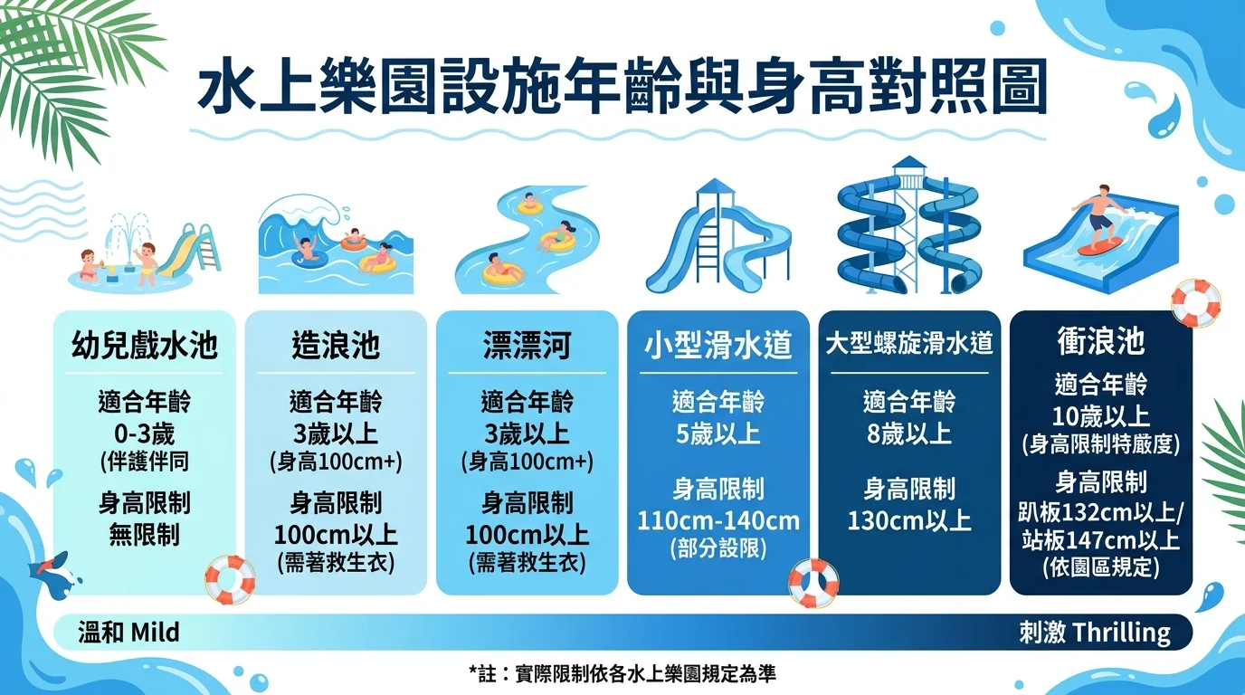 出發前確認各水樂園的設施身高限制。我們有次帶小孩去,結果大型滑水道要 130 公分以上才能玩,他差了 5 公分差點哭出來。