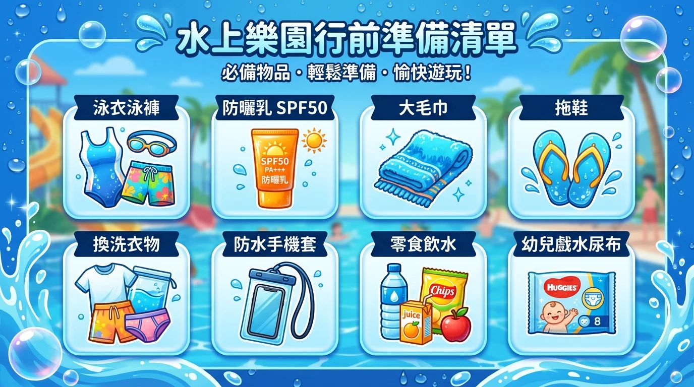 A: 泳衣、防曬乳(SPF50)、大毛巾、拖鞋、換洗衣物、防水手機套、零食飲水。帶幼兒的加帶戲水尿布。建議多帶一套備用泳衣,小孩換衣服速度比你想像的慢。
