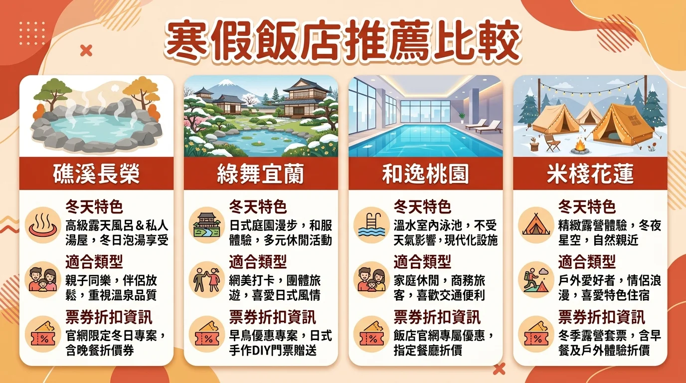 TL;DR: 寒假扣除農曆年大多是淡季,飯店價格比暑假便宜很多。選有溫泉和室內設施的飯店最合適,搭配電子票券(最低 2 折起)更是超值。平日入住品質好又省錢。