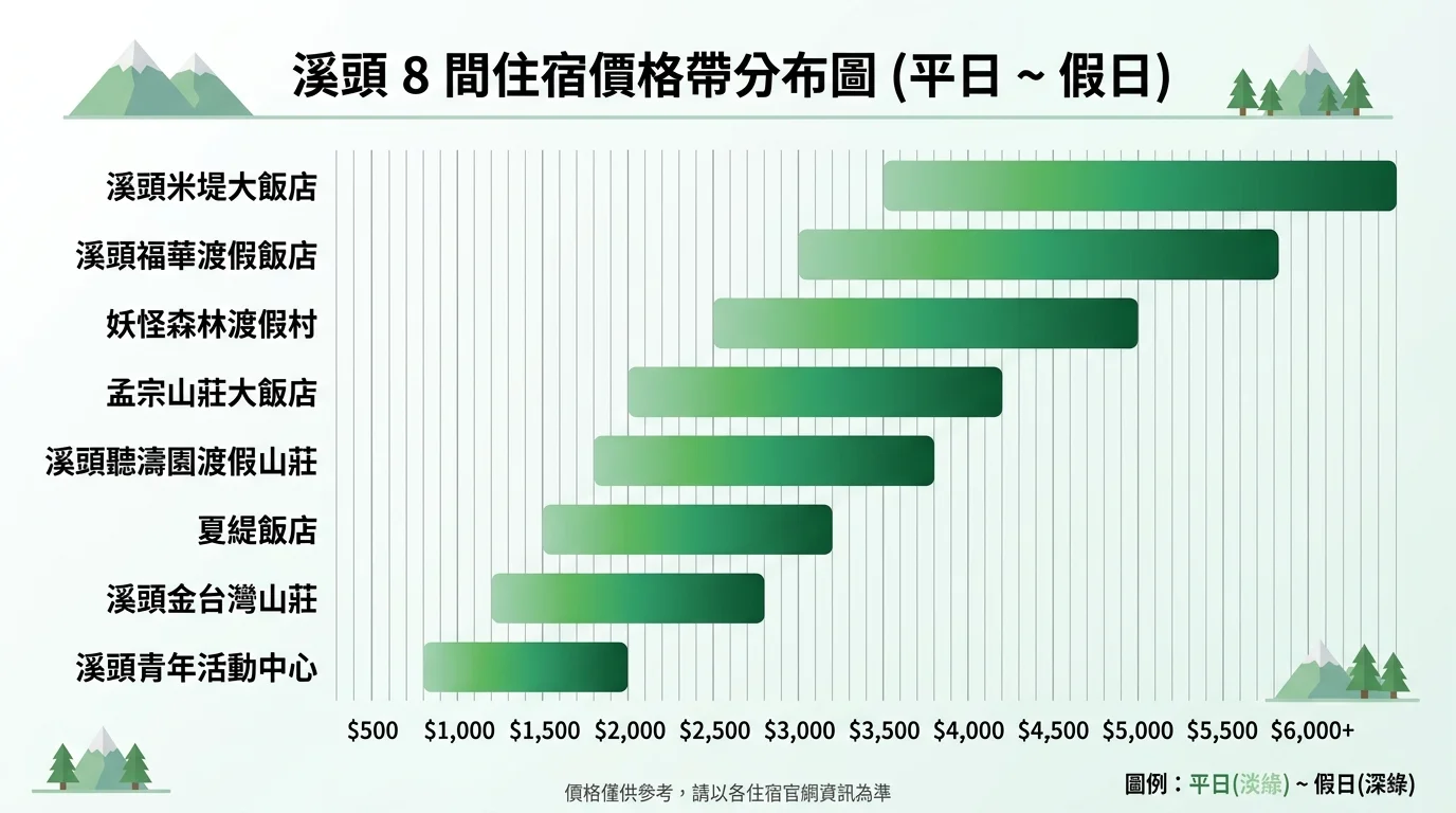 | $1,500 以下 | 雅筑小站、夏緹飯店(平日)、孟宗山莊(平日) | 乾淨基本、預算友善 |